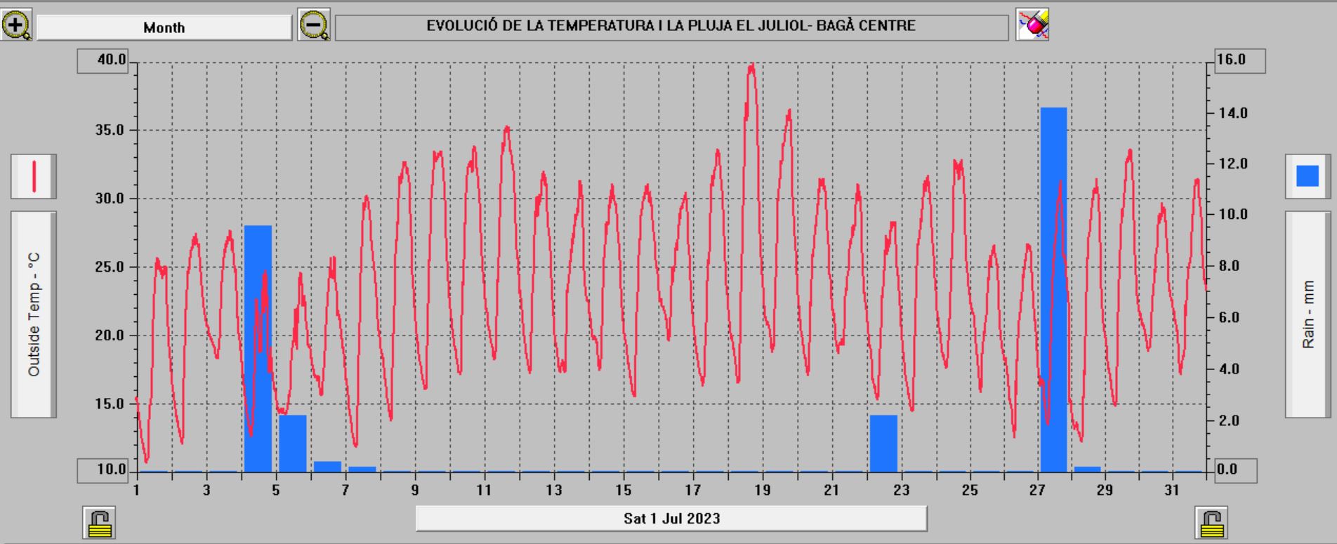 Tot i no qualificar-se d’onada de calor sinó de pic de calor, l’episodi breu del 18 de juliol va ser suficient per deixar una màxima històrica de 40,2 ºC a Bagà nord (valor rècord de la sèrie). No va arribar a ser-ho a l’estació de Bagà centre, amb 39,9 ºC, dues dècimes per sota el valor del juny del 2019.